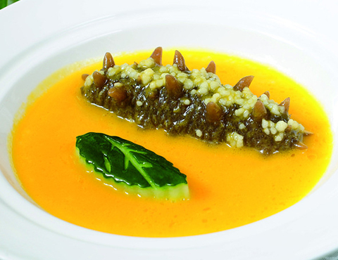 1、海参放入上汤中小火煨15分钟,取出备用。