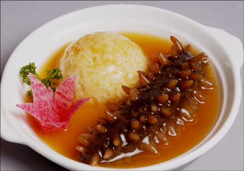 3、海参放入鲍汁中小火烧5分钟,放入湿淀粉 勾芡,淋明油后出锅放入盘中,扣入糯米饭, 放胡萝卜、黄瓜即可。